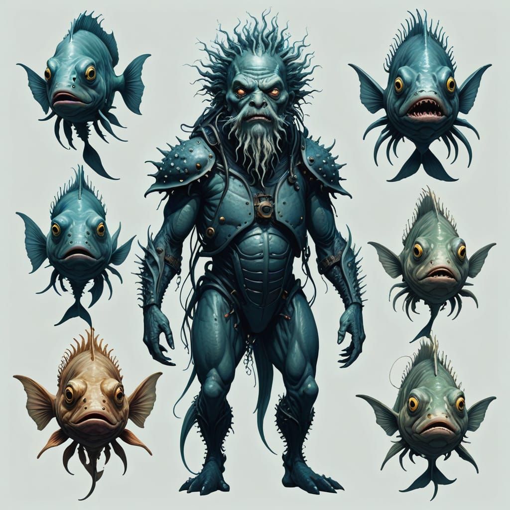 A digital artwork depicting bizarre human-like monsters inspired by deep sea fish. The image reimagines underwater creatures with humanoid forms and grotesque features.