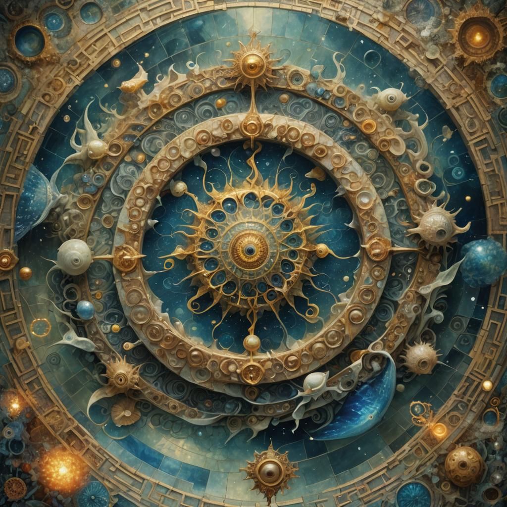 This image presents a kaleidoscopic mandala featuring fish, shells and floral elements. The artwork blends symmetrical, fractal designs with high resolution details in a dramatic and colorful style.