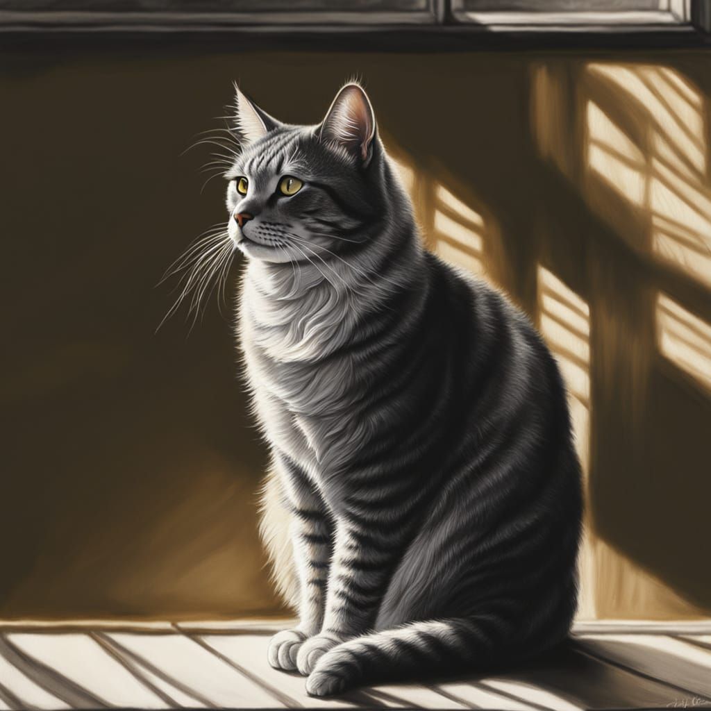 This image showcases a hyperrealistic charcoal drawing of a beautiful cat sitting on a windowsill. The close-up, medium shot captures fine fur texture and warm, golden hour sunlight on the wooden frame.