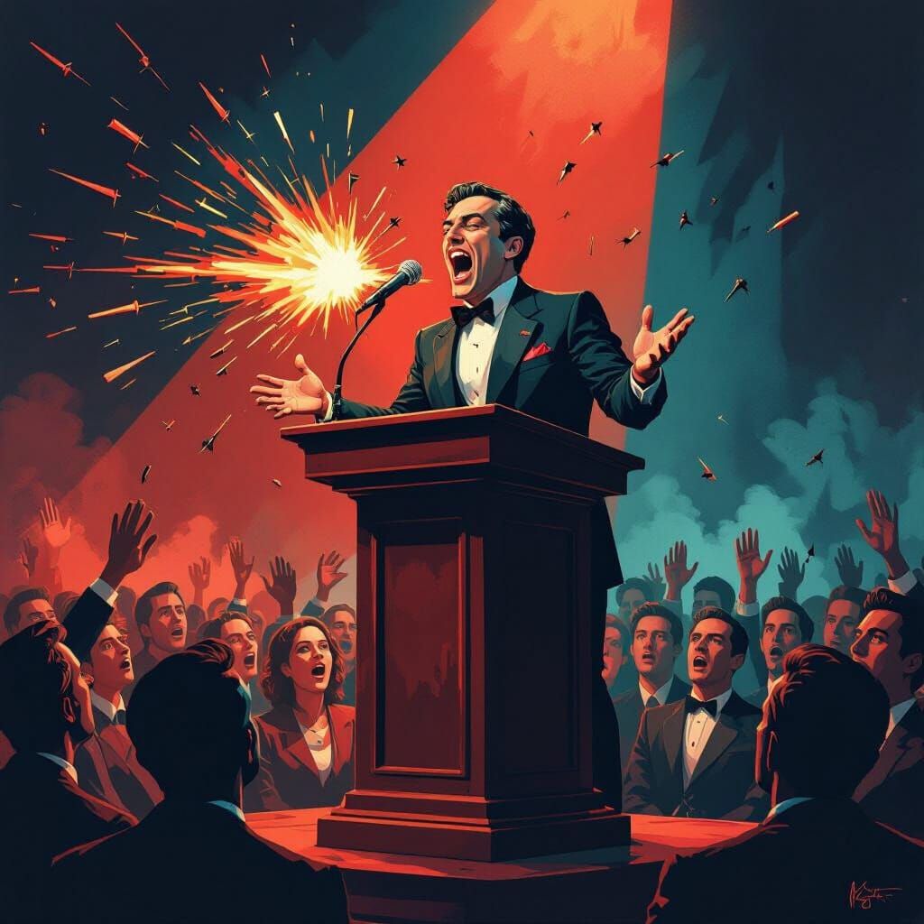 A hyperrealistic illustration of a speaker's words becoming sharp projectiles, causing fear and confusion in the audience. Features stark lighting and a high-contrast palette, evoking conflict and manipulation in a surrealist style.