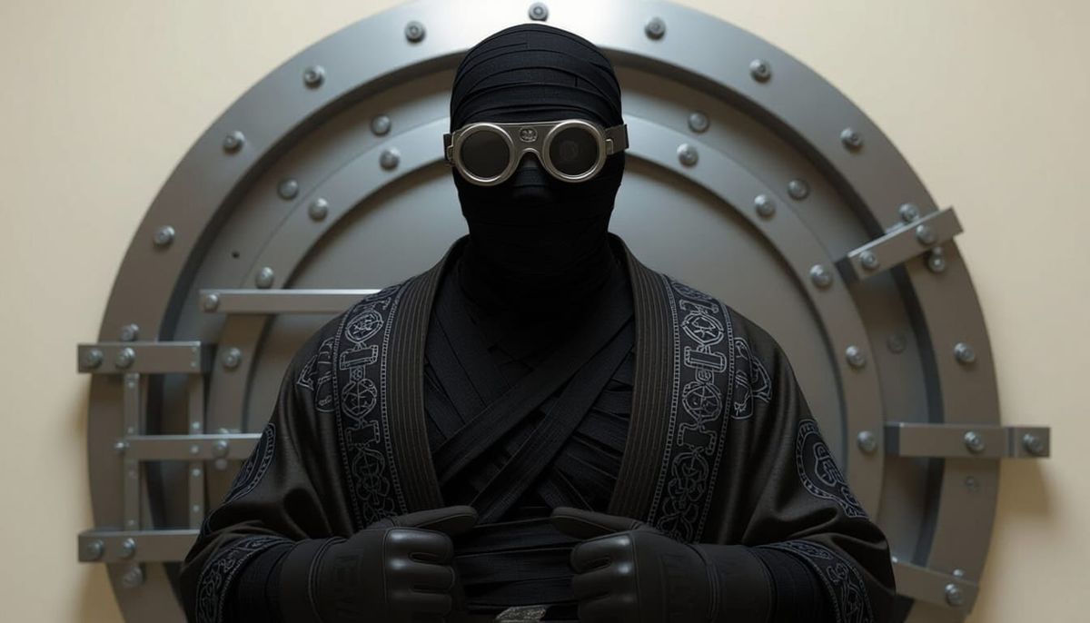 This image shows Dr. Jack Griffin as a mummy in urban clothing, featuring a balaclava, welding glasses, and a robe. A bank vault is visible behind him in a dramatic digital matte painting style.