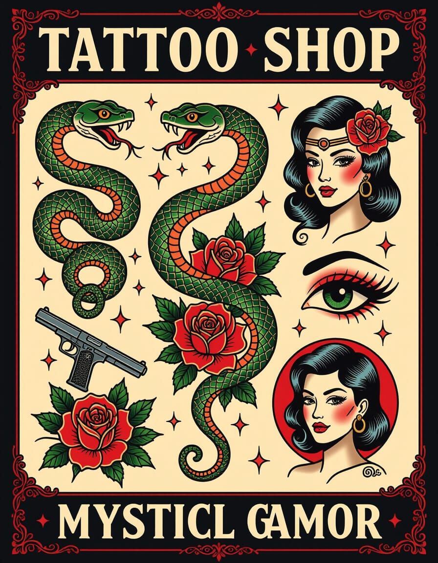 This image shows a tattoo flash sheet in a traditional tattoo style. The sheet features mystical snakes, roses, eyes, and women with guns, all rendered with bold outlines and a vibrant color palette.