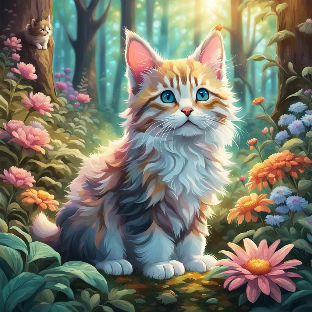 A dreamy illustration of a kijjikon, a fantastical mix of a kitten and a rabbit, surrounded by lush flowers and trees, bathed in warm sunlight and vibrant pastel colors.
