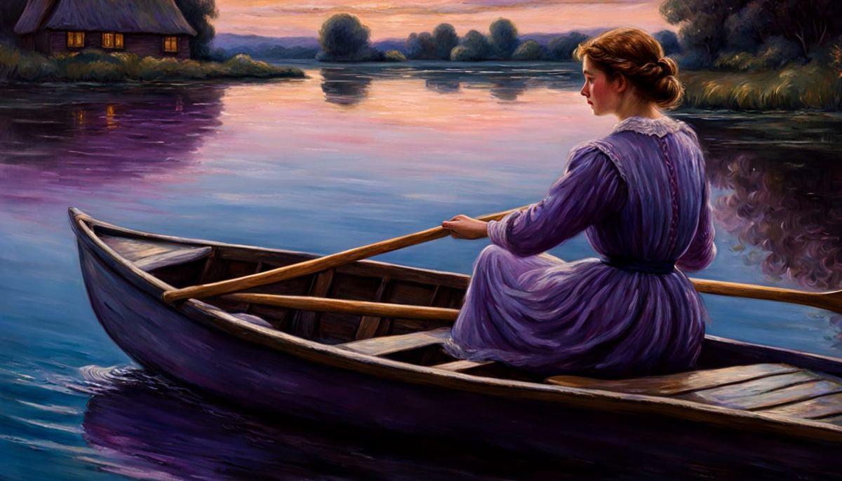 This serene image depicts a peaceful moment on a river near a charming cottage. A person rows a boat under the soft, feathery glow of a moonlit night, surrounded by gentle water and idyllic scenery.