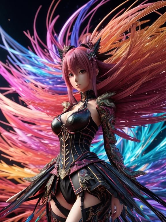 This image shows a beautiful woman rendered in a 3D anime style, surrounded by colorful fractal structures. The artwork is highly detailed with exquisite lighting and composition.