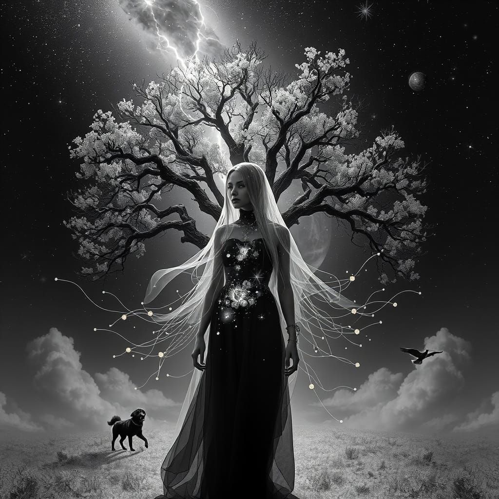This image depicts a mysterious woman standing at the center of a self-rolling horizon, in a world of black and white where physics is mere suggestion. Her face is hidden behind a transparent mask revealing shadows and galaxies in constant expansion. Her hair is replaced by filaments of light and impossi...