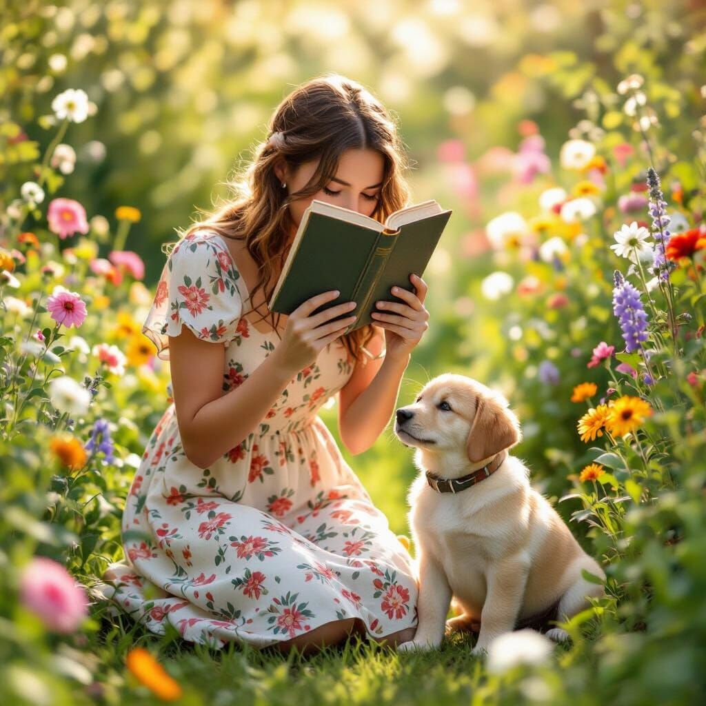 This image shows a young woman in a sundress kneeling with her Labrador puppy in a flower-filled garden. She holds a book, obscuring her face, in soft morning light. The scene is reminiscent of classic children's book illustrations.