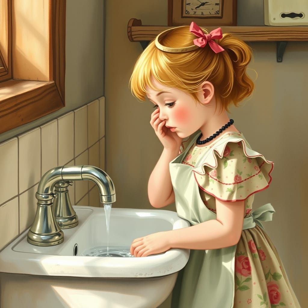 This image shows a young girl in vintage clothing washing her face at a sink. The artwork evokes a whimsical, watercolor style reminiscent of classic children's book illustrations.