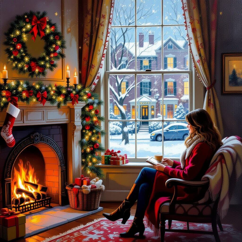This image shows a woman relaxing by a fireplace in a cozy Christmas-decorated apartment. The view through the window reveals a snowy street scene, all rendered with vibrant colors and soft textures reminiscent of romantic art.