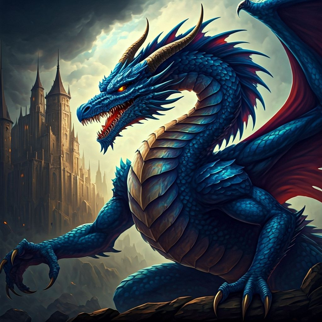 A vibrant anime-style image of a blue dragon with iridescent scales protecting a medieval castle. The dragon features a fiery gaze and dynamic lines, enhanced by hyper-realistic textures.