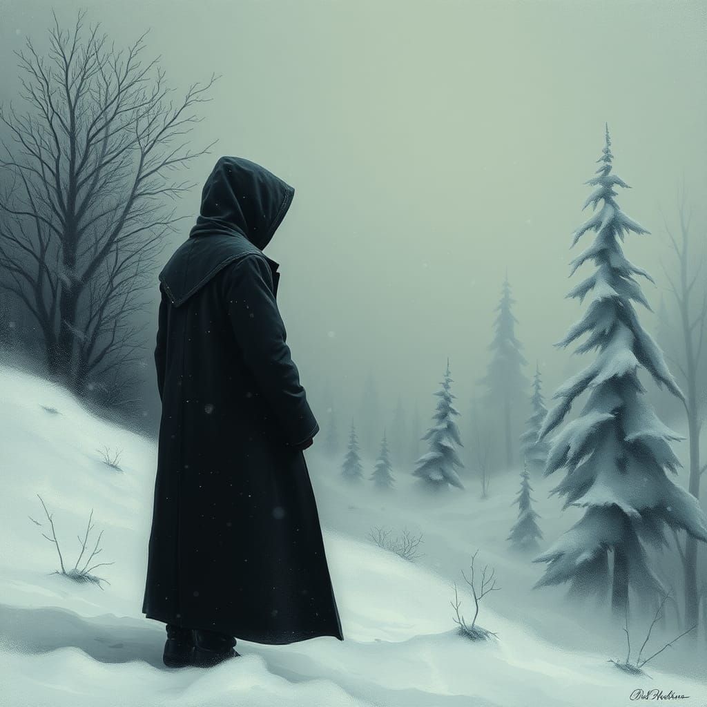 A solitary figure in a dark coat stands in a frozen wilderness amidst swirling snowflakes and icy trees. The image is rendered in muted colors, with atmospheric lighting and expressive brushstrokes.