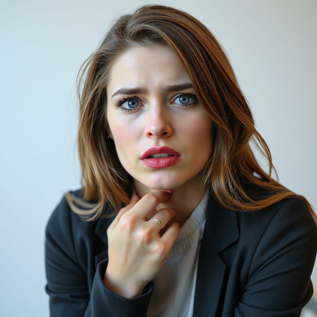 This image shows a beautiful woman battling the flu in a minimalist environment. Her blue eyes and pink lips stand out against her pale skin in this realistic digital art piece.