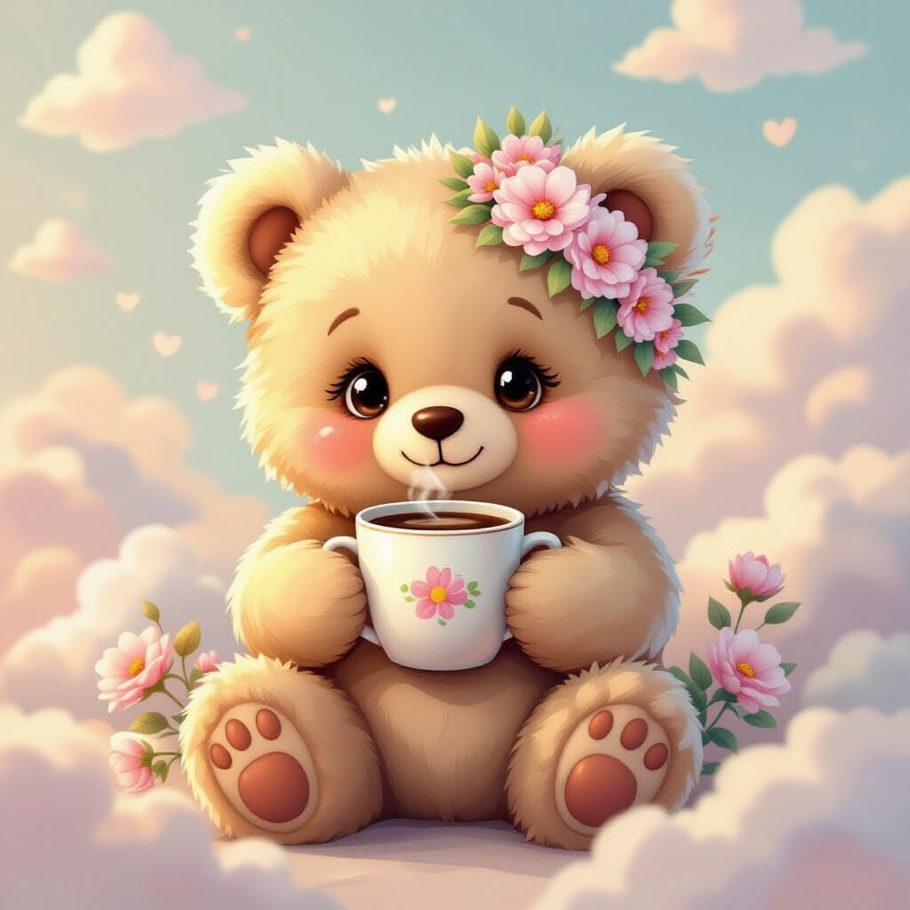 This image shows a fluffy watercolor bear holding a coffee cup, surrounded by pastel flowers and soft clouds. It features high detail and warm lighting in a kawaii aesthetic.