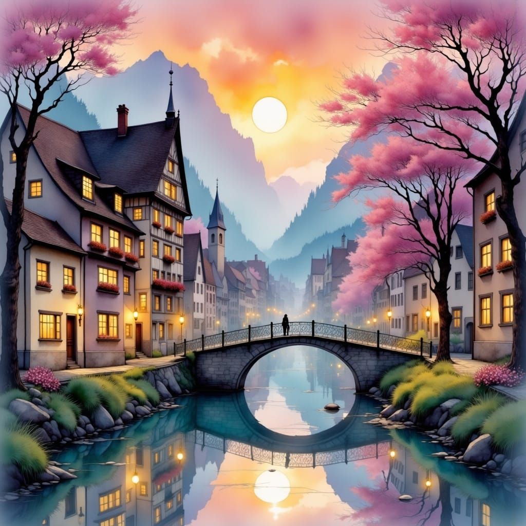Imagine Zurich’s Altstadt old town reimagined in a dreamy, surreal East Asian ink-wash style illustration: narrow cobblestone lanes glow with coral, lavender, and teal hues, flanked by mist-shrouded half-timbered houses with flower-boxed windows tumbling between ancient guild halls. Soft brushstrokes blur stone bridges over the Limmat River, while cherry blossom trees bloom in ethereal pinks against twilight skies. A golden sun sets behind fog-draped mountains, casting warm halos on steep gabled roofs. Whimsical lanterns float above hidden courtyards; church bells echo through pastel-hued alleys. Blend traditional shanshui serenity with European medieval charm, serene, magical, timeless.