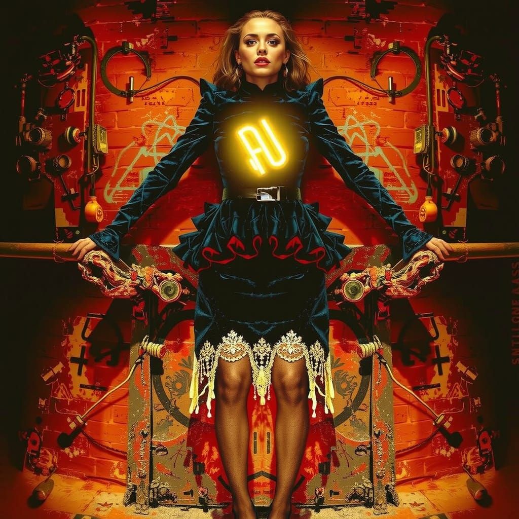 A striking woman with tousled hair and smudged eyeliner wears a velvet dress and ripped stockings. She leans against a graffiti wall, lit by a neon sign creating dramatic shadows in a gritty, chiaroscuro style.