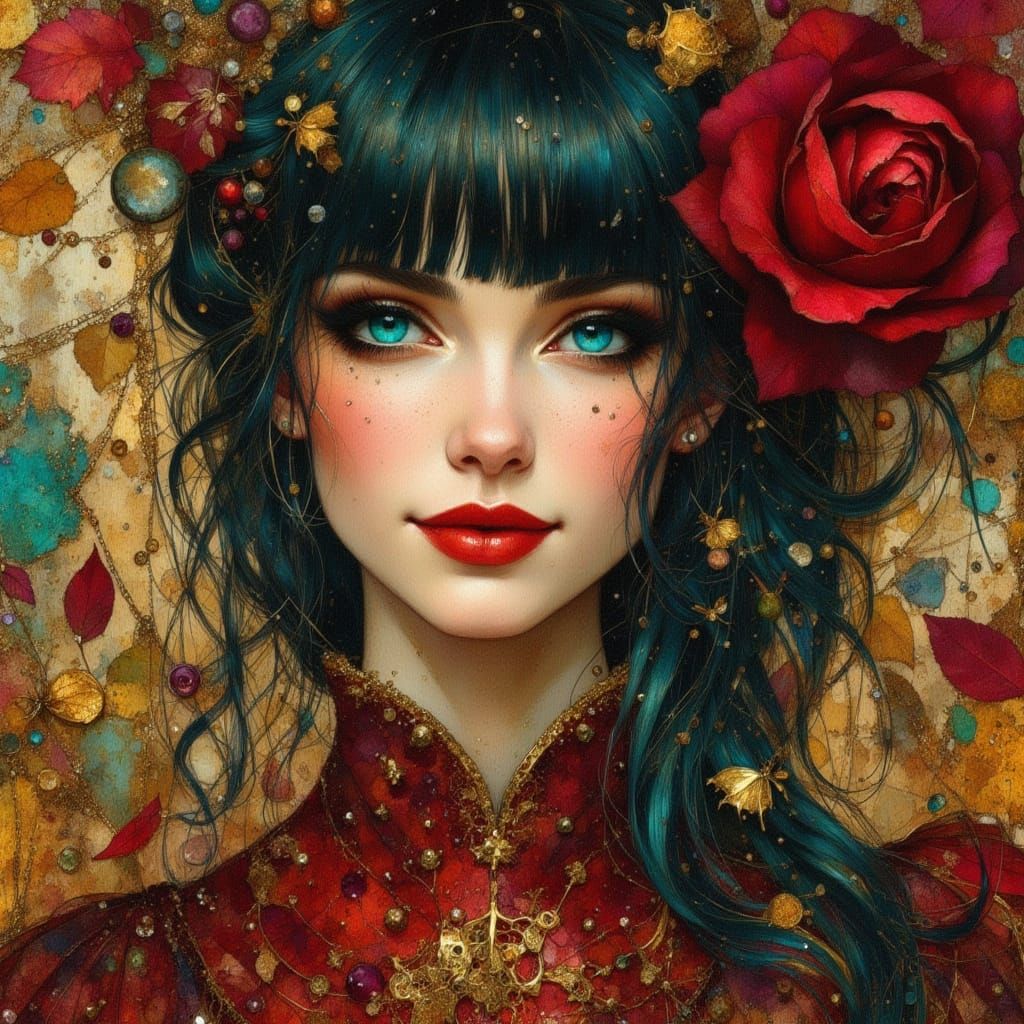 A striking portrait of a punk queen with black hair and red lipstick, wearing a dark red and gold dress. The image showcases hyperdetailed features in a cinematic style.