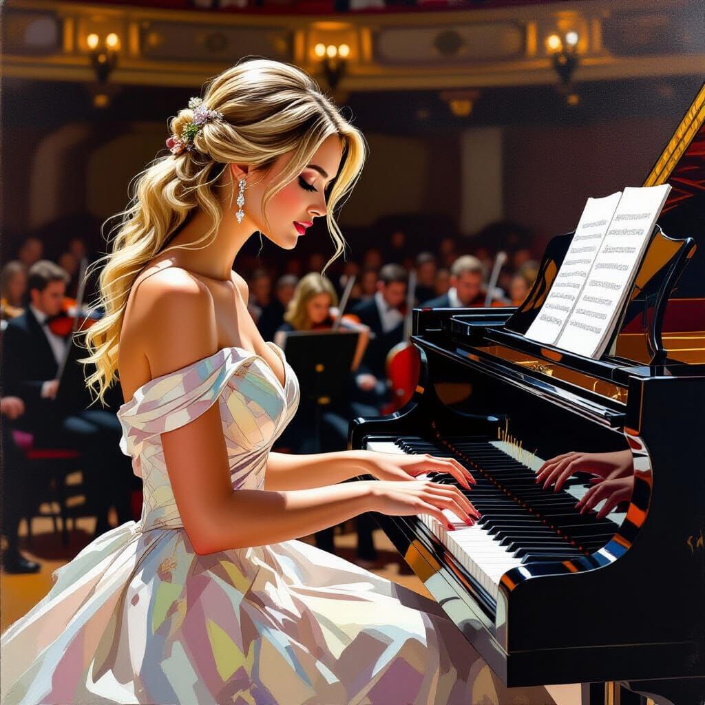A hyperrealistic image of a blonde woman in an elegant gown playing the piano in a concert hall. The artwork blends elements of photorealism with vivid color and expressive brushwork.