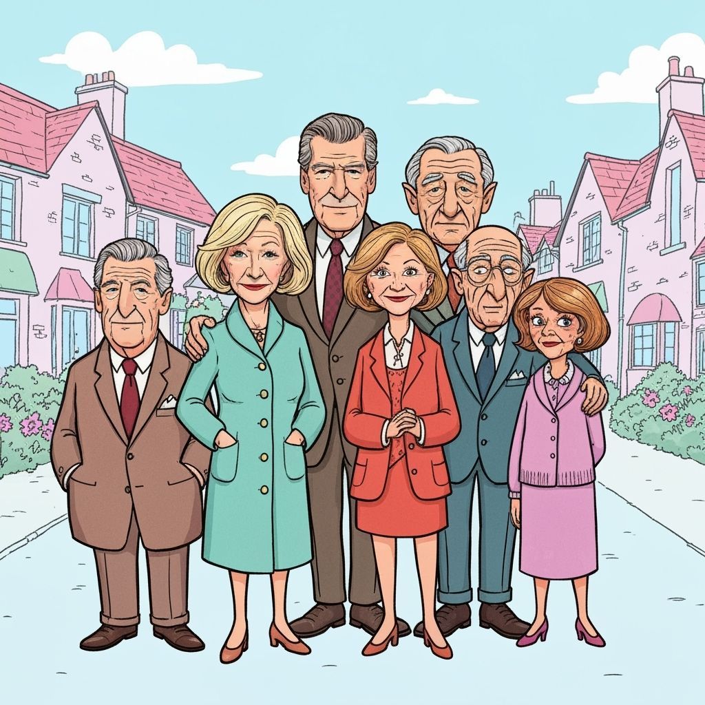A cartoon illustration of four quirky retirees in a pastel English village. The image has bold lines and exaggerated features with satirical elements in a whimsical style.
