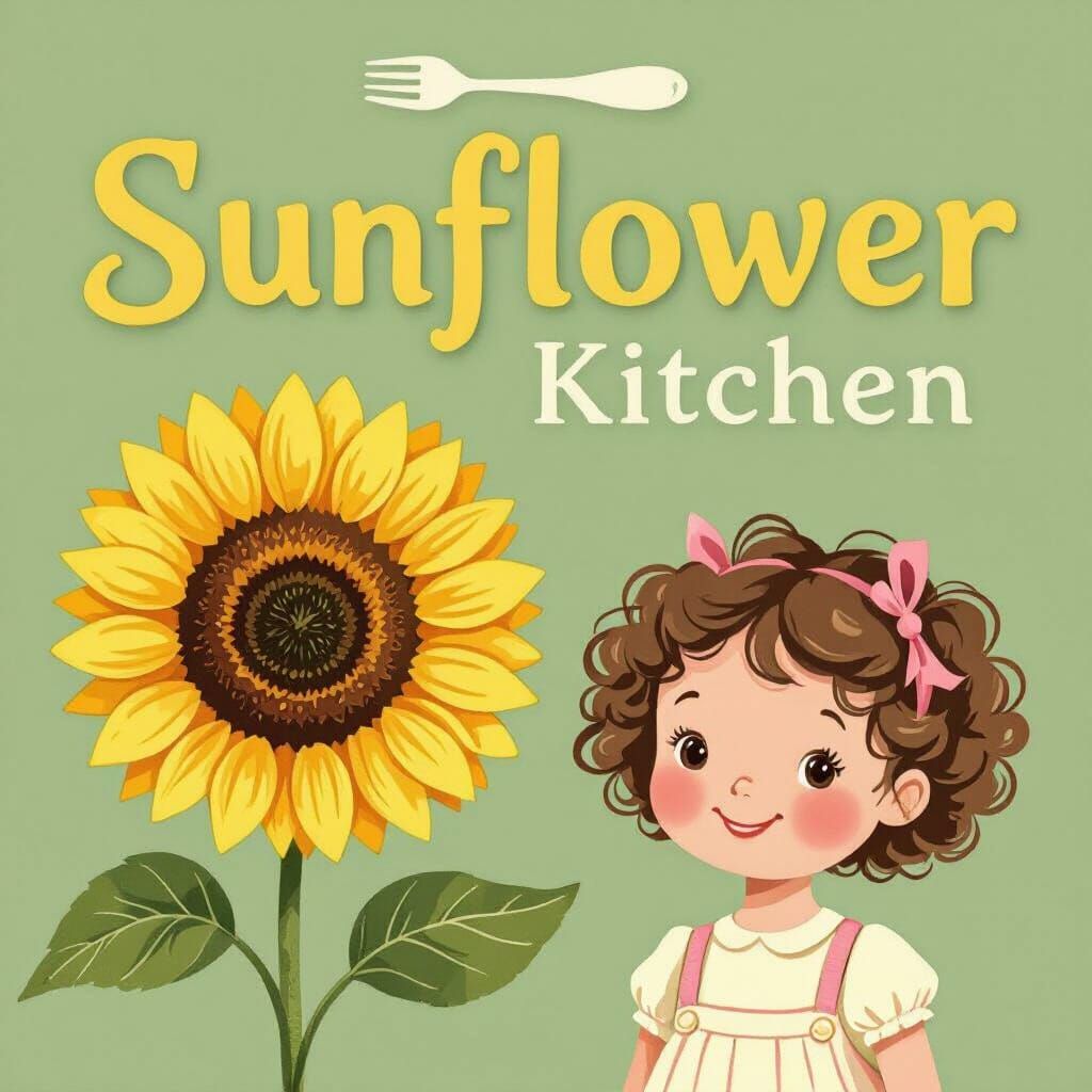 A cheerful logo featuring a bright yellow sunflower and 'Sunflower Kitchen' in a warm font. A smiling girl with curly hair adds a touch of whimsy in a clean, minimal style.