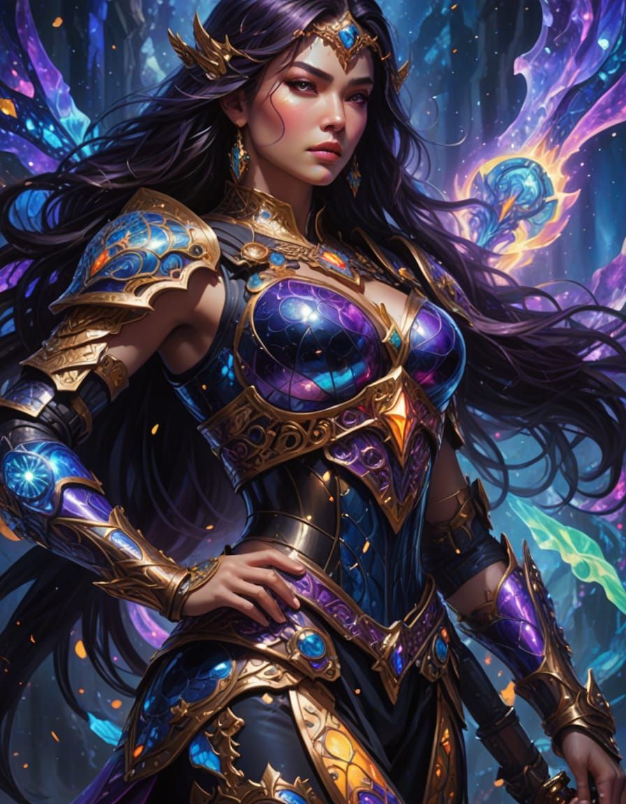 This image shows a determined warrior woman in intricate stained glass armor, holding a luminous cosmic weapon. Dramatic lighting highlights glossy, vibrant colors and a swirling nebula background.