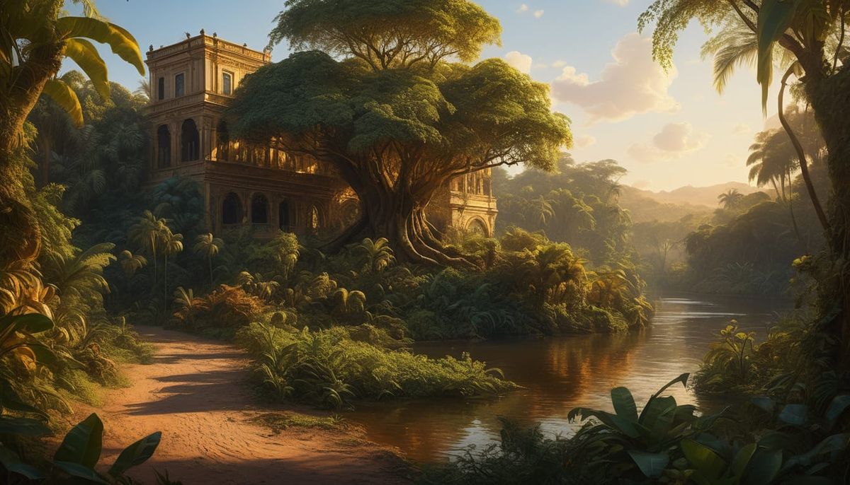 A vibrant baroque landscape featuring a jungle scene on the banks of the Nile. The oil painting captures golden hour sunlight and ornate foliage in vivid detail, creating a hyperrealistic and cinematic image.
