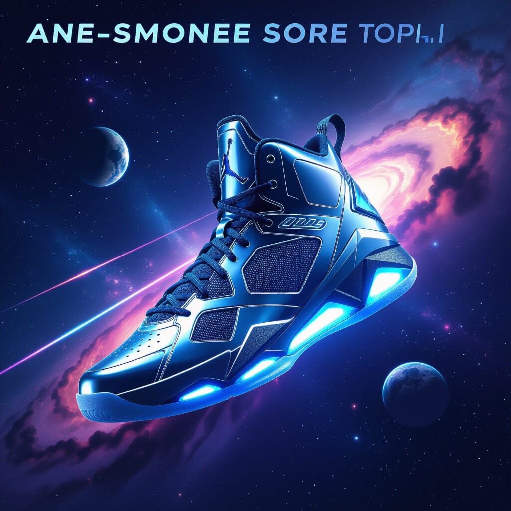 An ultra-realistic, cinematic poster featuring a sleek, futuristic basketball shoe floating in vibrant deep space. Features a chrome silver and electric blue color scheme with glowing accents.