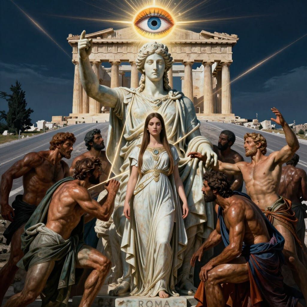 michelangelo paintings style and colours : rhodes colossus guys around with central beautiful armenian woman with ultra straight hair, shy, very connected spiritual, Parthenon in background with roads, third eye chakra,, ray of lights between characters, ultra deep contrast, large scene composition, ...
