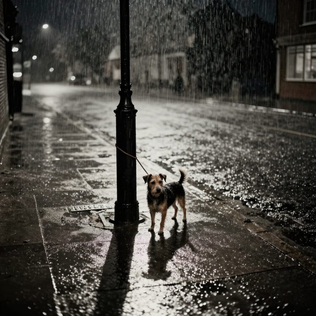 This image shows a small, wet dog tied to a lamppost on an empty street during a heavy rain. Captured in a wide-angle, film noir style with dramatic lighting and deep shadows.