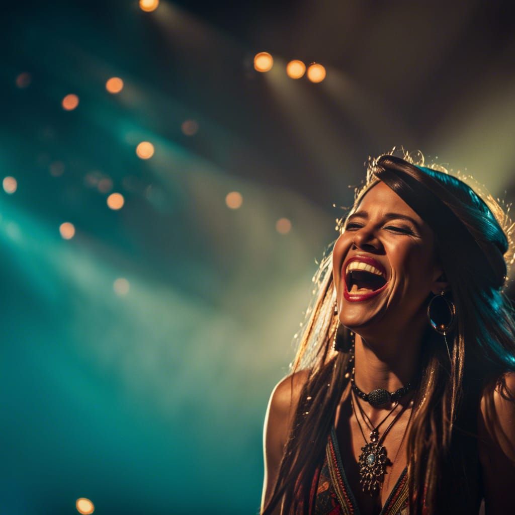 A hyperrealistic image of a singer laughing on stage during a folk rock performance. The atmospheric shot features smokey lighting and a high contrast, cinematic composition.