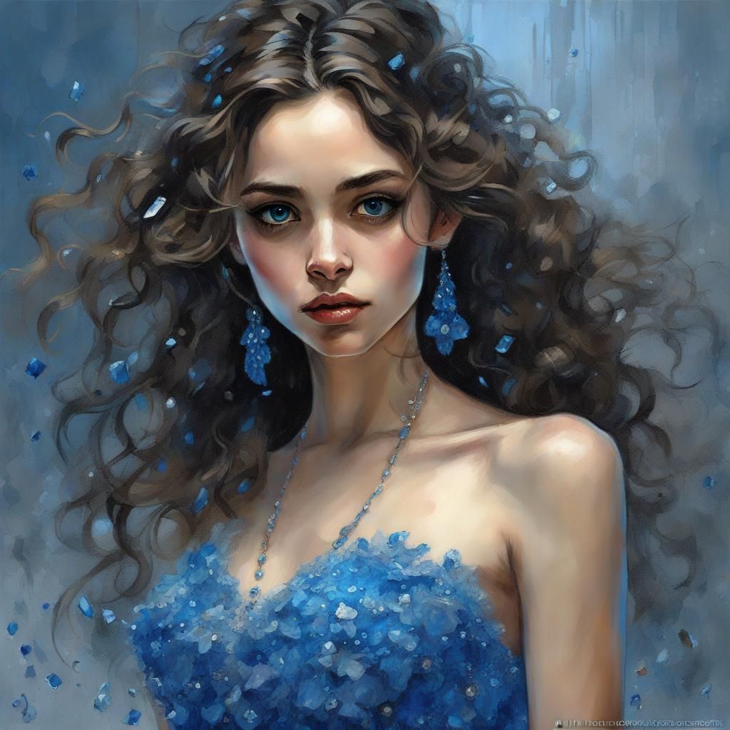 A digital painting of a young Latina woman with wavy brown hair in a glittery blue strapless gown. The artwork has an anime and manga-inspired aesthetic with creamy colors.