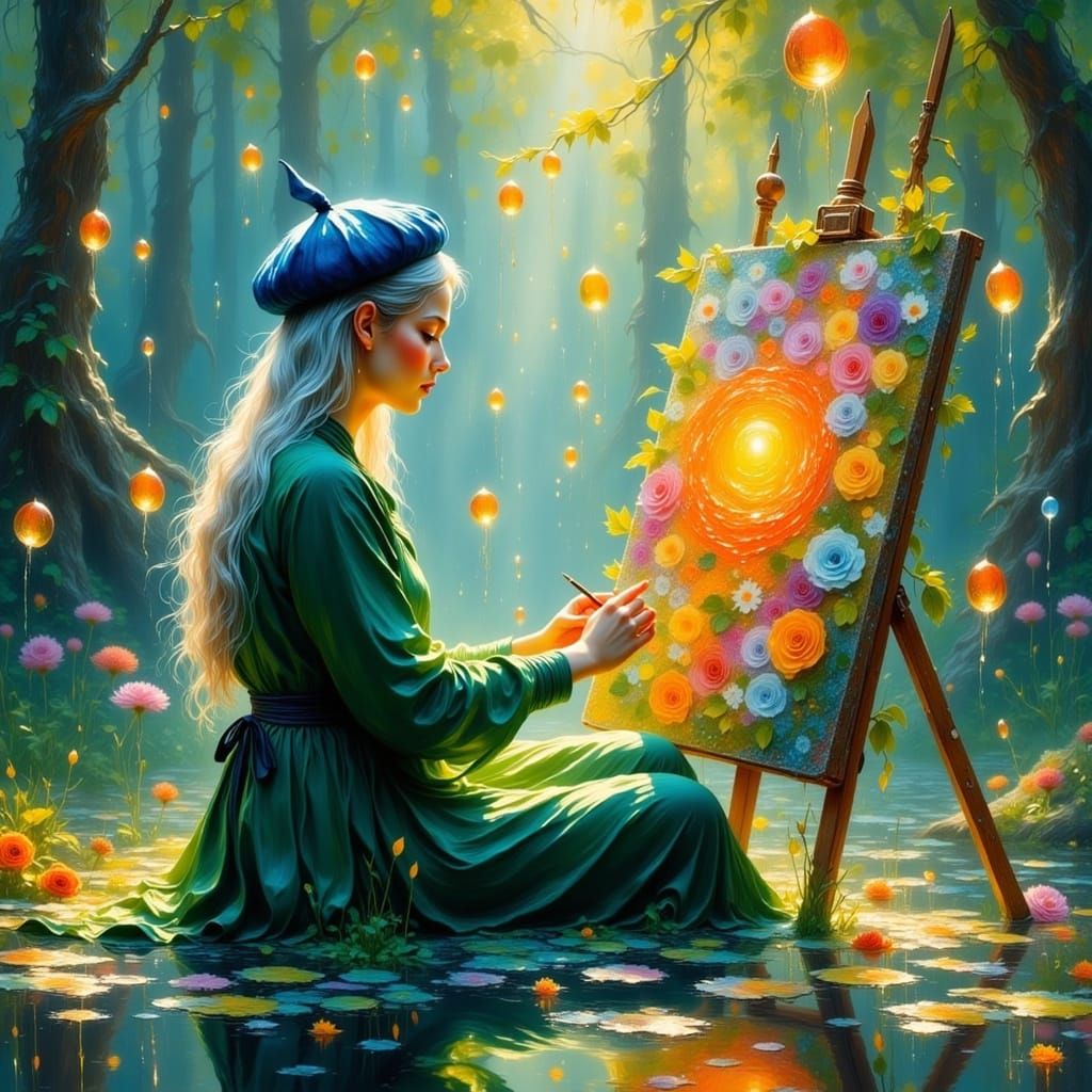 This image depicts an elfin creature in green robes and silver hair, wearing a blue beret, painting in a misty forest. Colorful raindrops create abstract art on the canvas and wet surface.