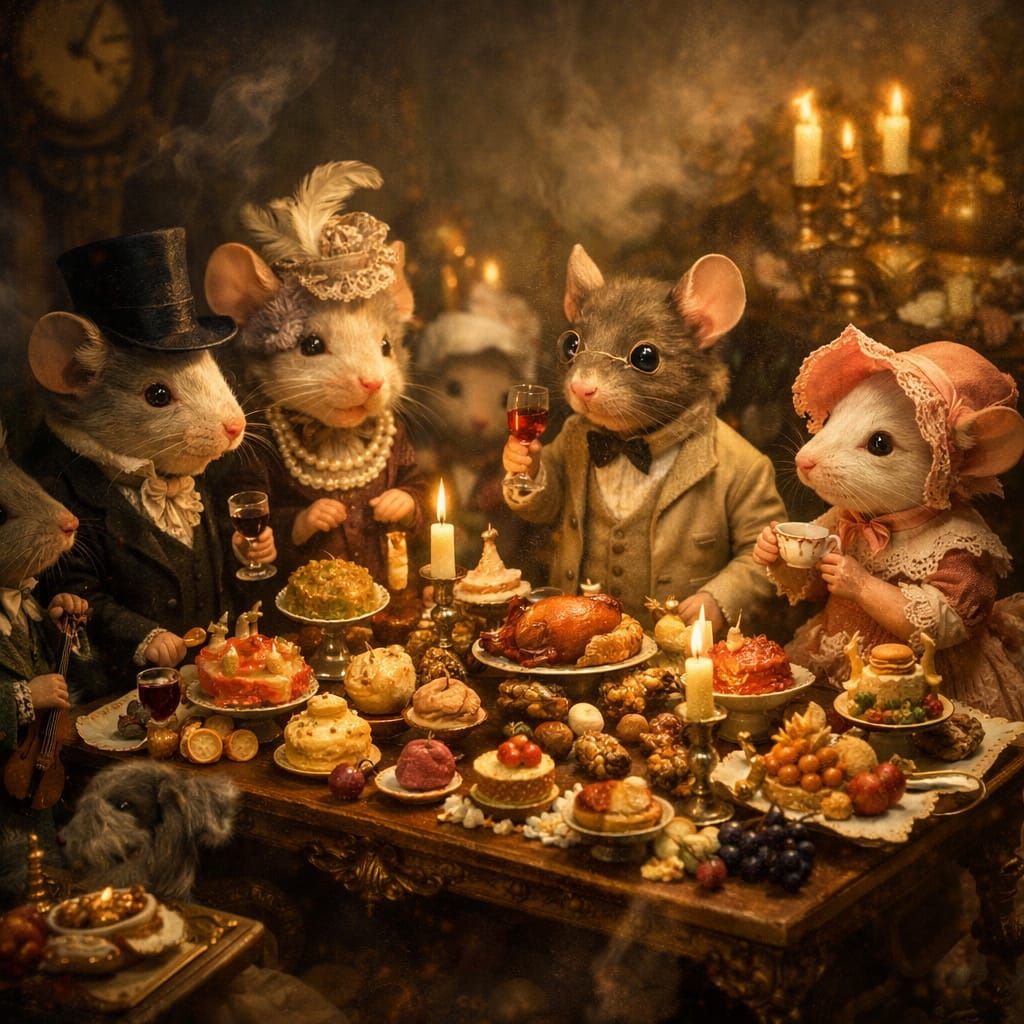 A whimsical scene of mice elegantly dressed in vintage attire, gathered around a miniature banquet table laden with tiny, exquisite foods. The lighting is soft and intimate, highlighting the abundance of the feast and the fleeting beauty of their revelry. Executed in a digital art style with surrealist ...