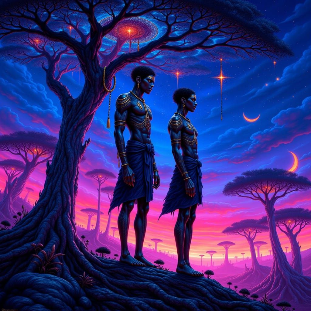 This image shows a dreamlike West African mythological landscape at twilight, featuring tribal guardians and ethereal baobab branches. The style blends traditional and digital media with bold colors and textures.