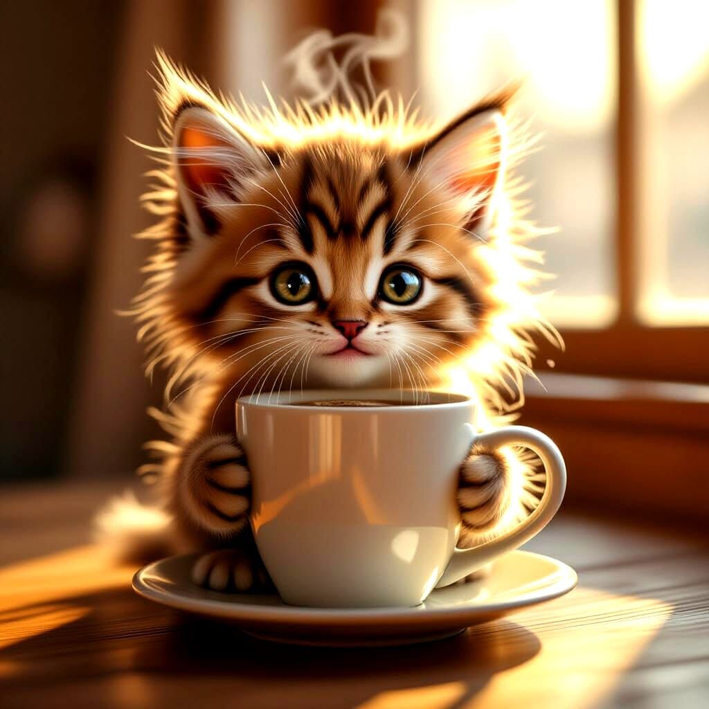 This photorealistic image captures a cheerful kitten enjoying a cup of coffee. The scene is rendered with high detail, showcasing a warm and inviting morning moment.