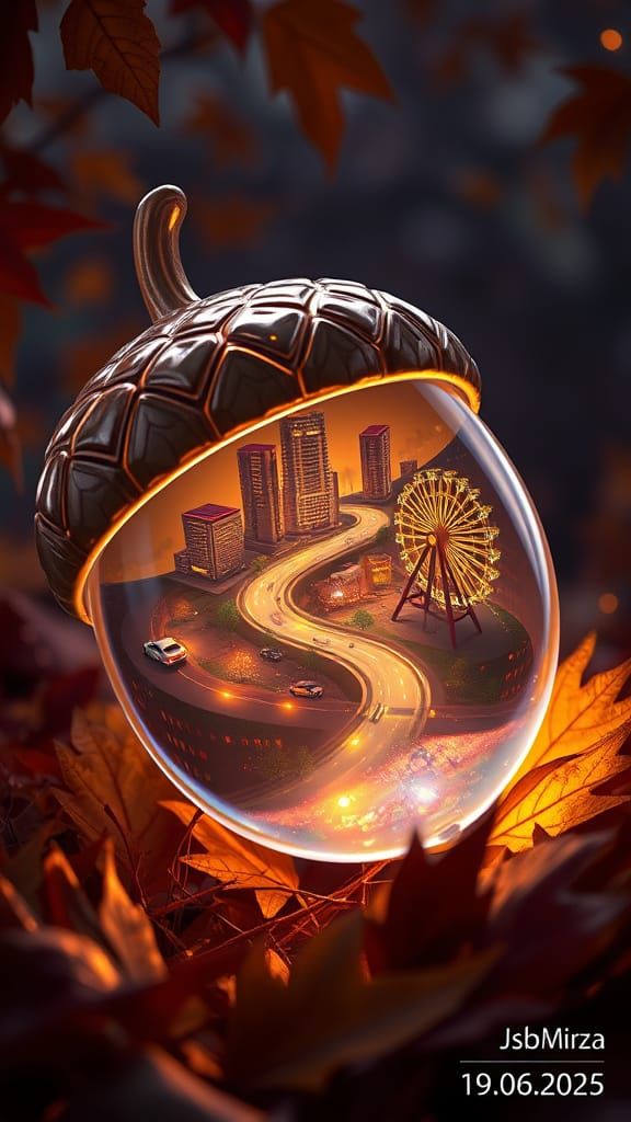 A striking picture of a golden acorn containing a miniature futuristic cityscape. The art features clean vector lines, an ambient glow, reflective surfaces and deep purples, golden highlights and glass blue in a twilight color palette.