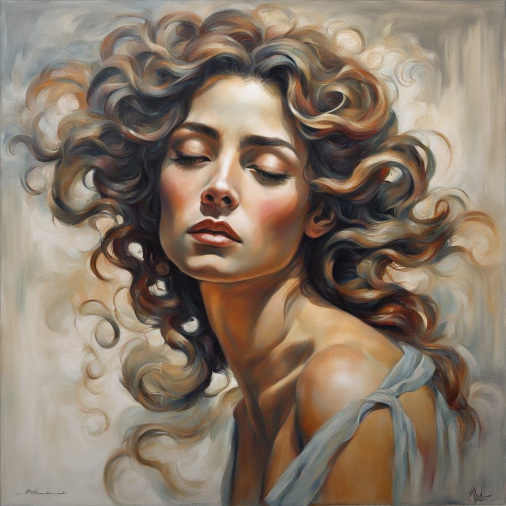 This image is a Renaissance-inspired portrait of a woman in a sensual pose, reminiscent of classic oil paintings from the 60s era. Featuring a closed-eyed beauty with a hint of mystique, the artwork embodies the style of Michelangelo's iconic portraits.