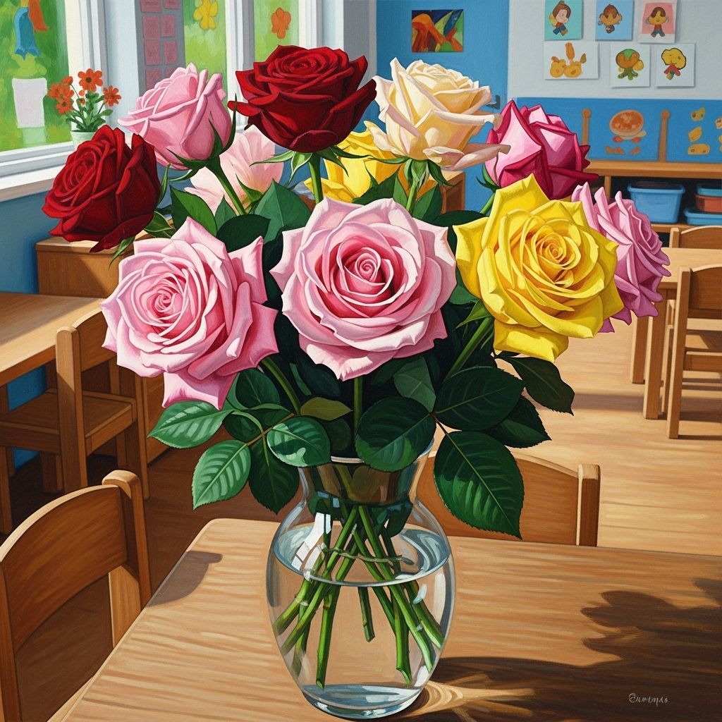 A vibrant bouquet of colorful roses sits on a wooden table in a kindergarten classroom. The image evokes a blend of gentle realism and bright colors.