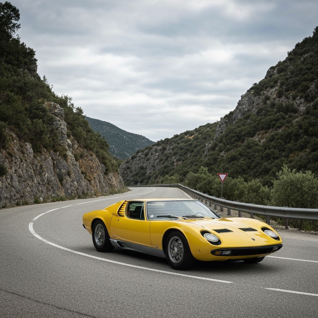 This image features a classic 1968 yellow Lamborghini Miura driving along a scenic Italian mountain road, showcasing vintage automotive beauty.