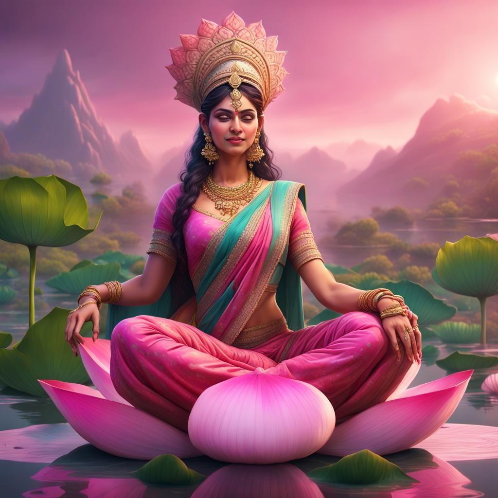 This image shows a traditional Indian goddess with a crown, seated on a pink lotus. She is wearing a multicolored saree and smiling, rendered as detailed fantasy concept art.