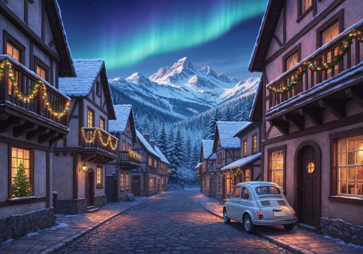 This image depicts a quaint medieval village street decorated for Christmas, featuring festive lights, an old Fiat, and a snowy forest backdrop under a vibrant aurora borealis. Rendered with atmospheric lighting and rich colors.