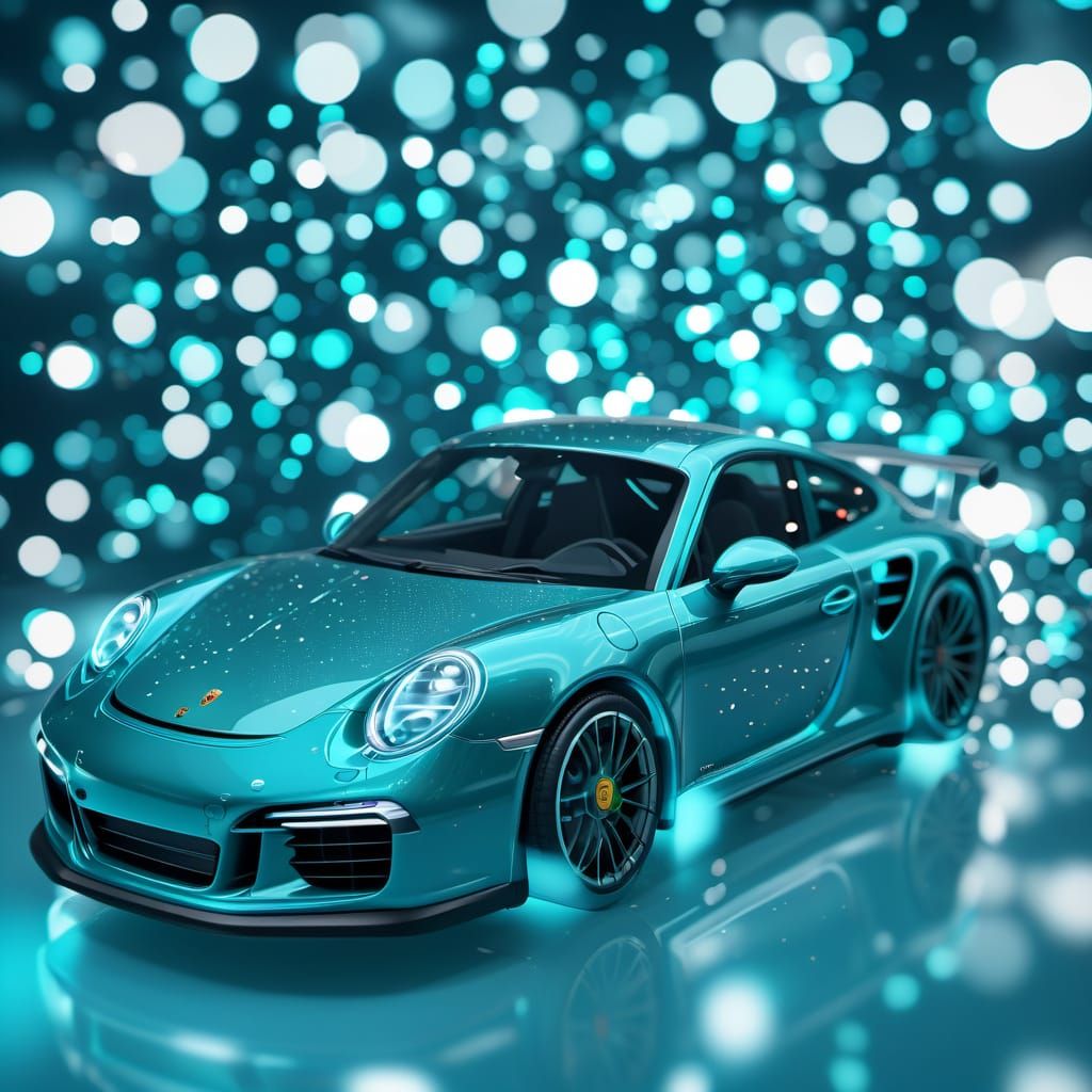 This image showcases a vibrant turquoise blue Porsche with a sophisticated 3D shading technique and a soft bokeh background effect.