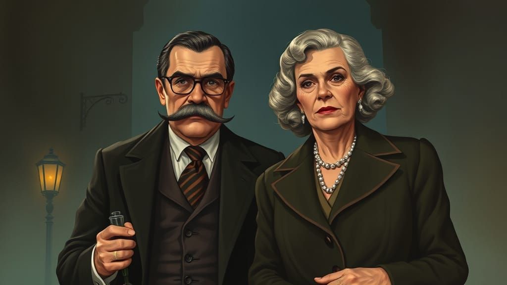 This image depicts a 1930s-style couple, the corpulent businessman Harry Driscoll and his wife Amalia, set in a world of Lovecraftian horror, reminiscent of the works of Gustave Doré and Greg Rutkowski.