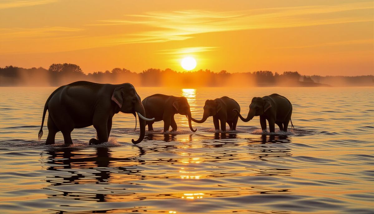 A heartwarming image of cartoon elephants frolicking in the Wadden Sea at sunset. The scene evokes romanticism with golden light and a hazy atmosphere, reminiscent of 19th-century paintings.