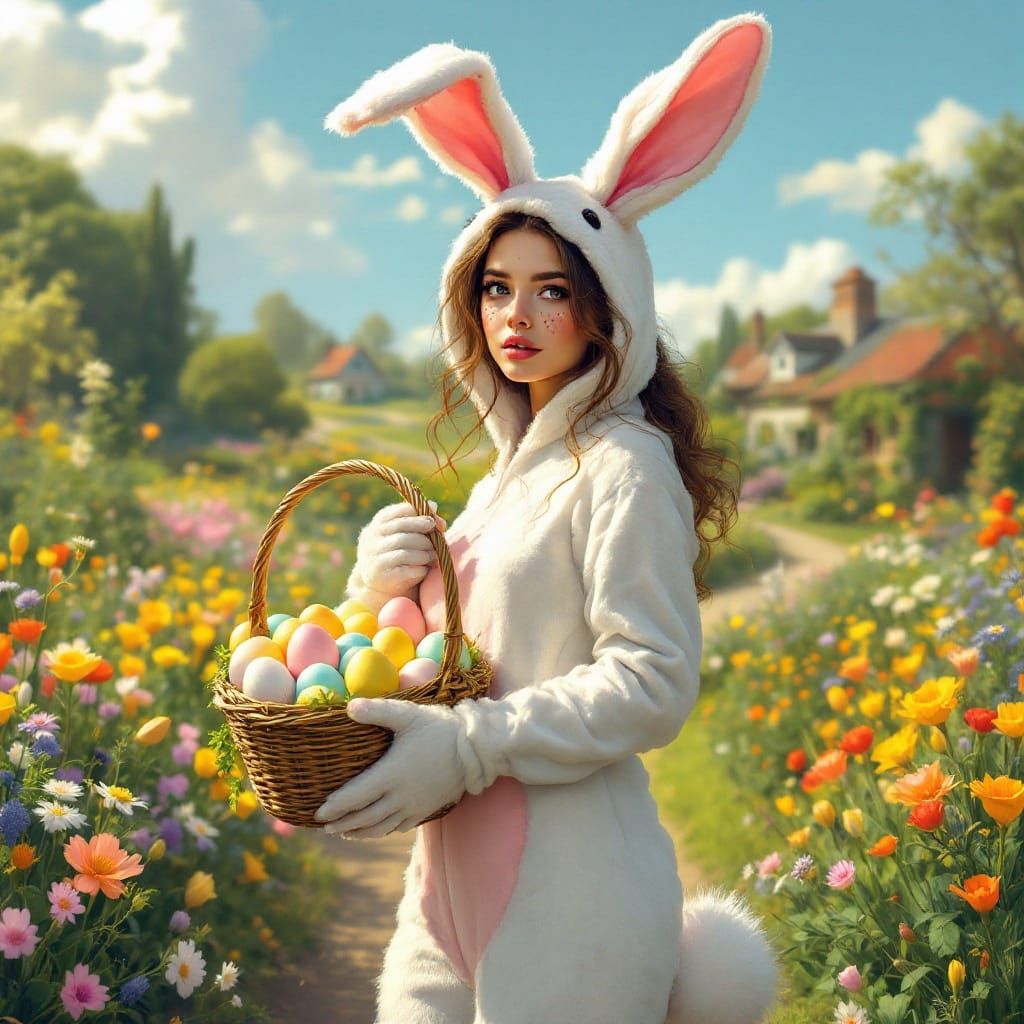 This image shows a stunning, realistic fantasy illustration of a beautiful woman in a bunny suit, surrounded by a gorgeous garden and small houses in the distance, as she carries a basket of colorful eggs.