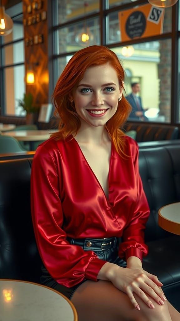 A striking picture of a beautiful young woman with red hair and green eyes, sitting in a cafe. She wears a red silk blouse and black leather miniskirt, smiling confidently in soft, golden lighting. The photo evokes effortless elegance.