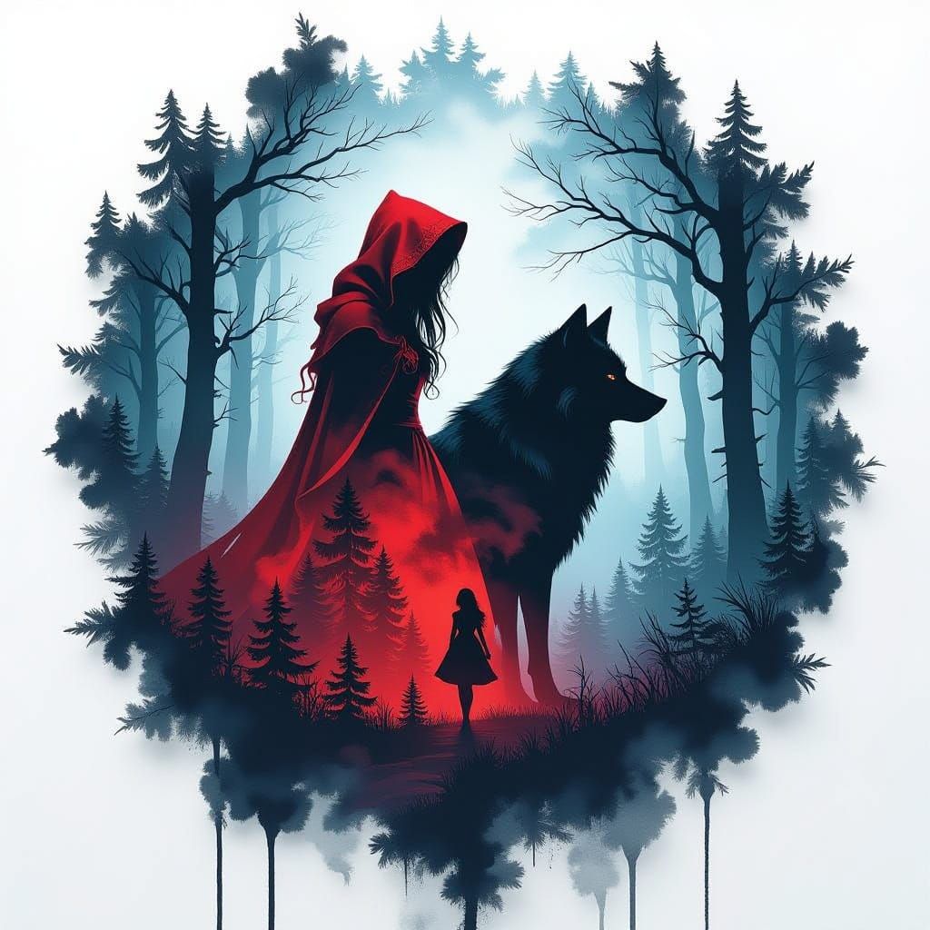 A striking image showing Little Red Riding Hood and the Wolf as silhouettes in a double exposure against a dark forest sky, rendered with dramatic lighting and depth.