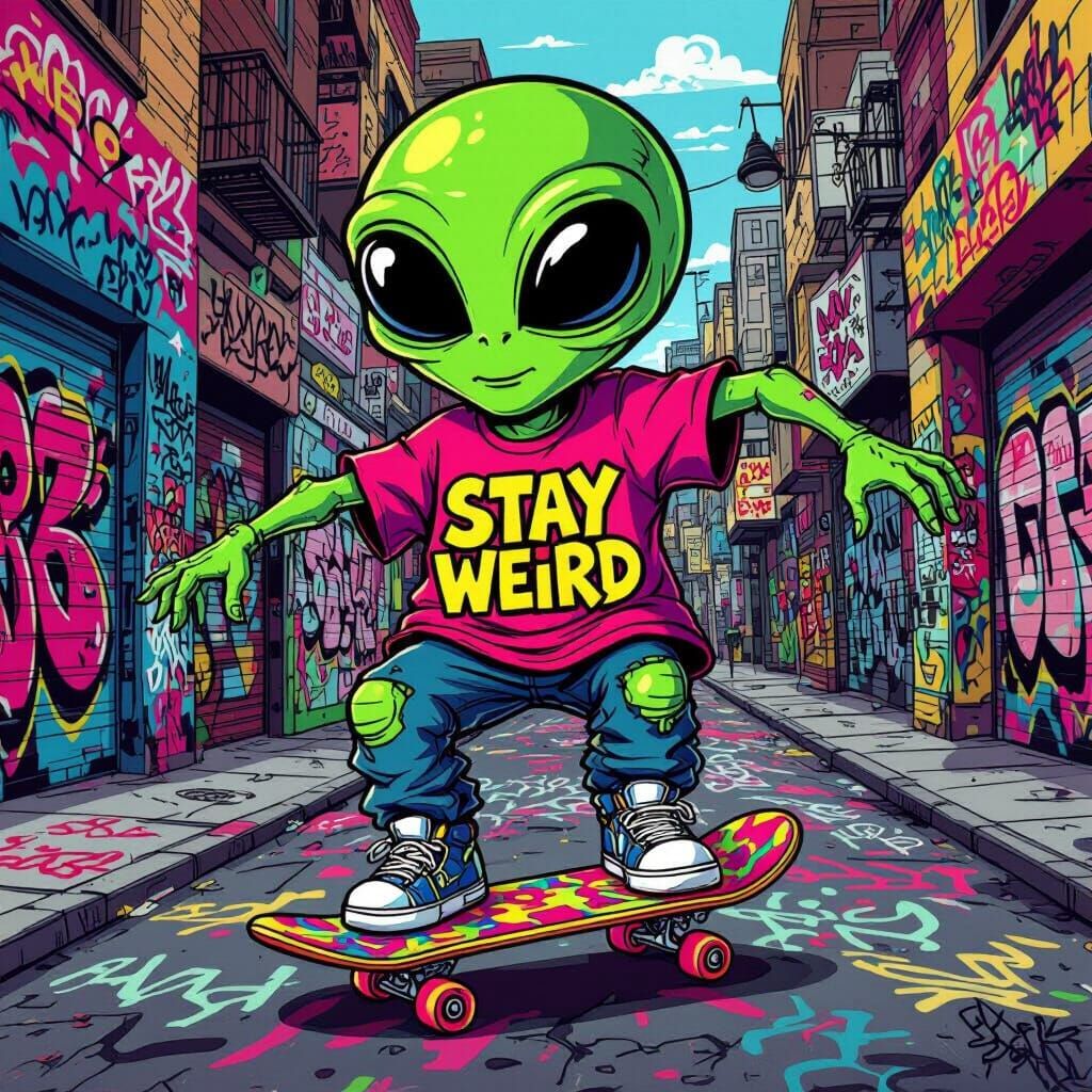 A playful cartoon alien skateboards amidst vibrant graffiti, sporting an oversized t-shirt with neon "STAY WEIRD" text in a detailed doodle art style.