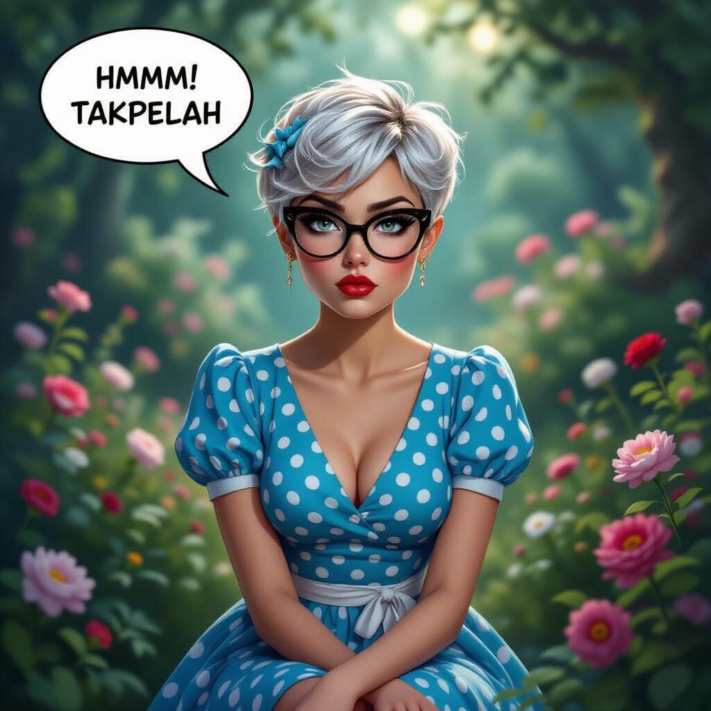 A whimsical portrait of a woman with a pixie cut and cat-eye glasses in an enchanted garden. She wears a blue polka dot dress and displays a sulking expression, in a fantasy illustration style.
