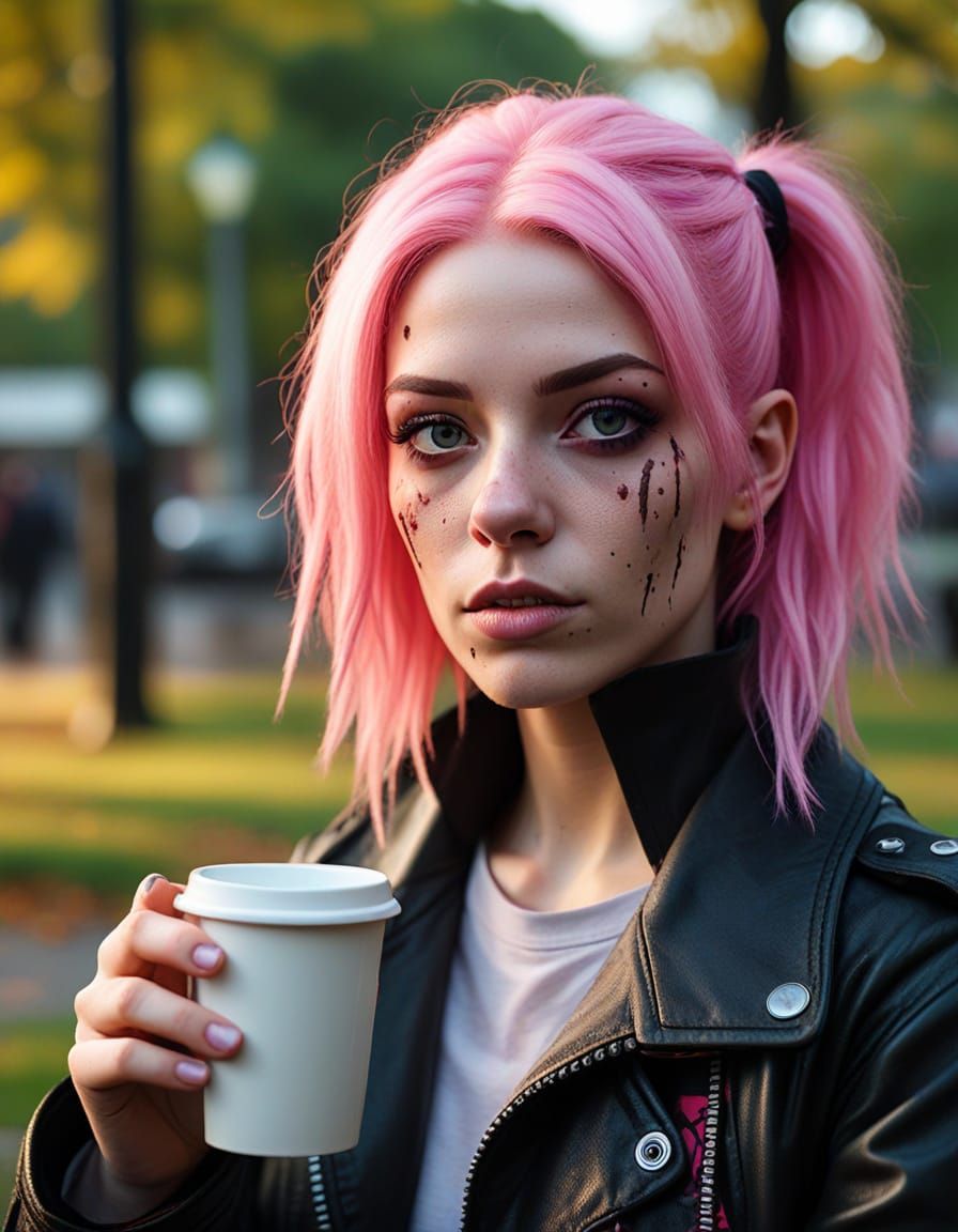 This image shows a close-up cyberpunk portrait of a young zombie woman with pink hair drinking coffee in a park. The image has a photorealistic, high-quality aesthetic.