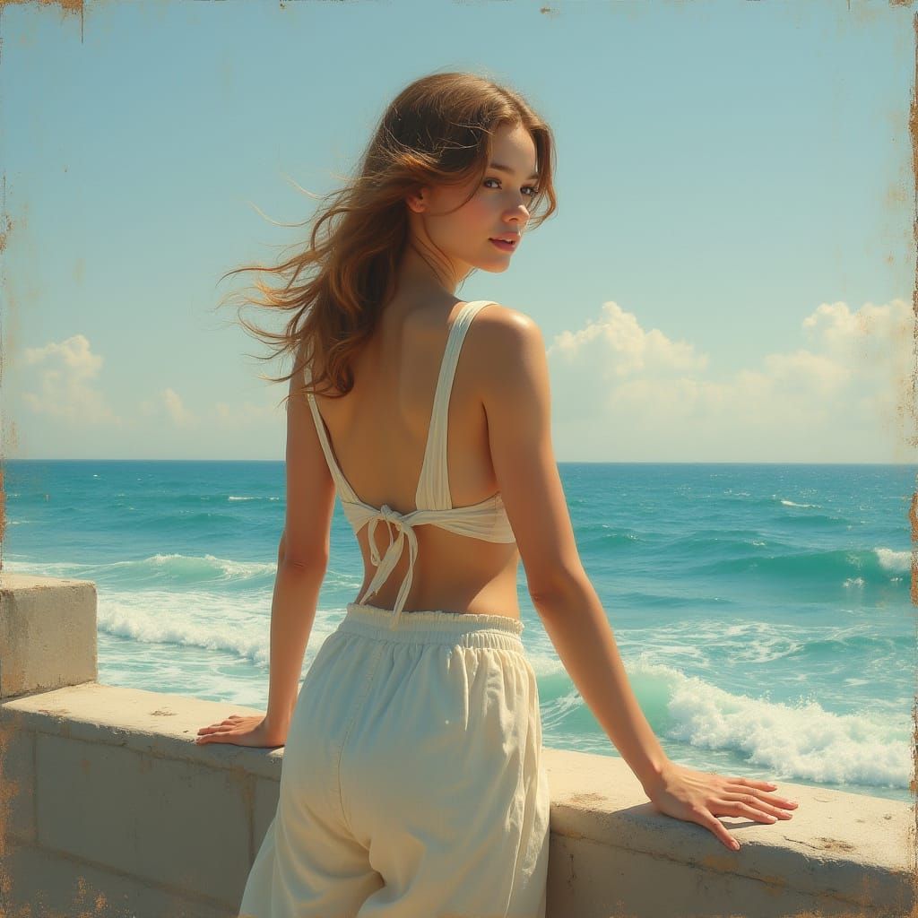 Uma jovem de 17 anos, com traΓ§os suaves e cabelos presos com fita de seda, apoia-se sobre o corrimΓ£o branco do pier ao entardecer. Seu olhar se perde no mar tranquilo, e ela segura contra o peito um caderno antigo encapado em linho bege com a inscriΓ§Γ£o βBGβ. O cΓ©u azul-acinzentado reflete-se na superfΓcie ...